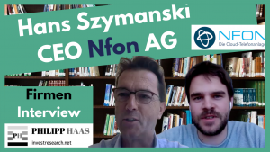 Die Nfon AG ist ein in Deutschland führender Anbieter von Cloudtelefonanlagen, was günstiger und flexibler ist als bestehende Lösungen. Das Unternehmen ist dabei nur ein Bruchteil des amerikanischen Pendanten Ringcentral wert und möchte in seinem Segment Marktführer in Europa werden. Interessant macht die Aktie auch die Shareholderstruktur mit einem Strategen und Aktivisten. Nfon wächst dabei mit um die 20% organisch, was das Unternehmen trotz Verlusten interessant macht. Grund genug ein Firmeninterview mit dem CEO der NFON Hans Szymanski zu führen, was dem Zeitgeist entsprechend im Homeoffice stattfand.